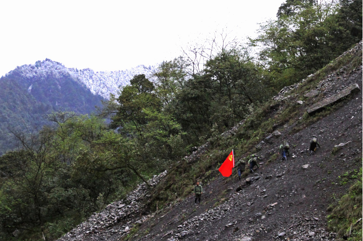 巡护队员肩扛党旗行走在雪山下