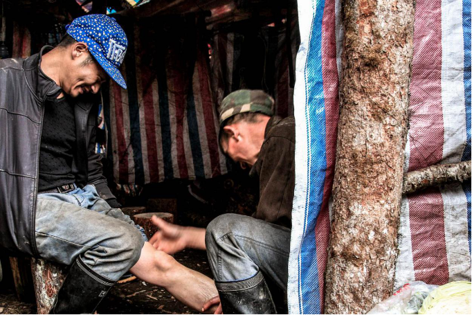 一名巡护队员正在帮助急行一天的队友放松肌肉