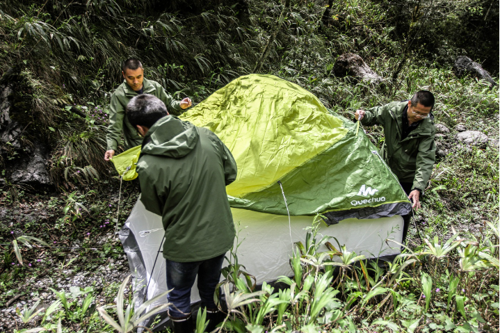 每天下午4点前,巡护队员就必须停下脚步,赶在天黑前寻找靠近水源、地势平坦的安全区安营扎寨。十天左右的巡护,除了偶尔落脚一处固定的“监测站”外,其余的夜晚,巡护队员们都在帐篷中度过。