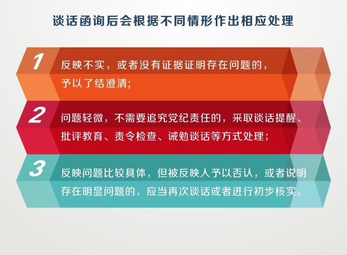 组织找干部谈话函询,不是故意找茬或小题大做,而是针对苗头性、倾向性、一般性的问题进行处置。如果反映不实,组织会予以澄清;如果干部如实说明情况且反映问题轻微,不需要追究党纪责任的,组织会采取谈话提醒、批评教育、责令检查、诫勉谈话等方式处理,及时了结,让同志放下包袱。可见,谈话函询既是了解情况,也是组织给予干部坦白澄清的机会 。