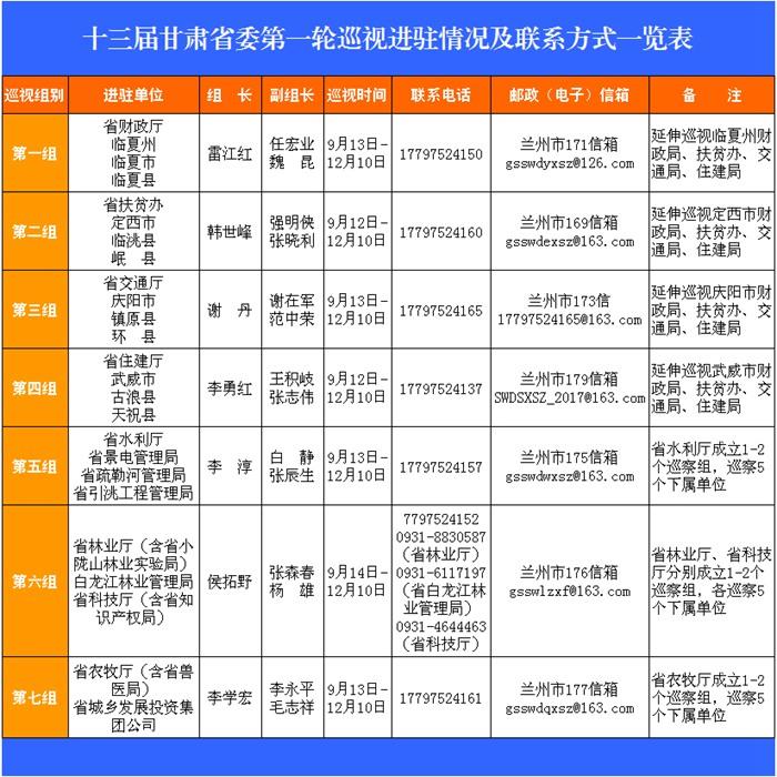根据甘肃省委统一部署,十三届省委第一轮巡视全部进驻并公布联系方式。为确保巡视取得实效,巡视时间由过去的两个月延长为三个月。