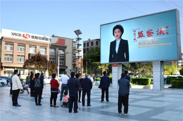 利用户外大屏循环播放中央纪委国家监委网站制作的“带你了解监察法”宣传短片。