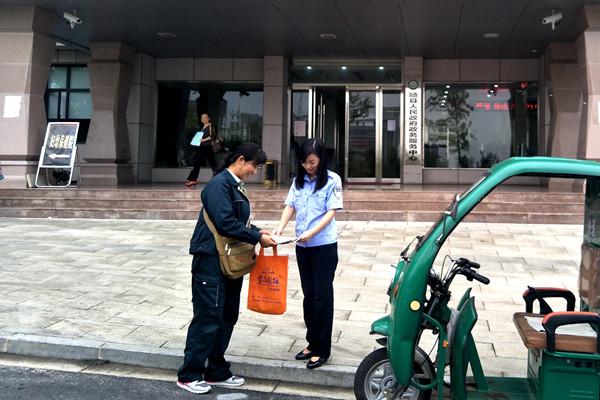图为随县“清廉邮路”服务队员朱艳翠正将国家《监察法》释义送到县政务服务中心公安局窗口工作人员手中