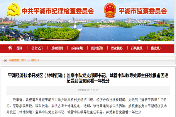 “给予姚某某留党察看一年处分,免去其平湖经济技术开发区(钟埭街道)监察中队党支部书记、城管中队教导处主任职务……”这是平湖市纪委、监委网站“曝光台”栏目通报的一起党员干部违纪案件。