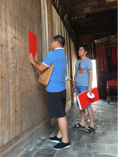 图为工作人员正在粘贴文物古建筑消防安全注意事项告知书