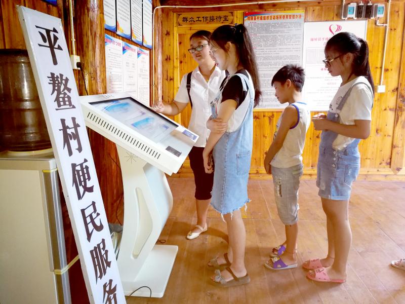 7月18日,在贵州省锦屏县平略镇平鳌村的便民服务站,一群建档立卡贫困学生正在镇纪检工作人员的引导下,序次通过民生资金查询机比对着自己受教育精...