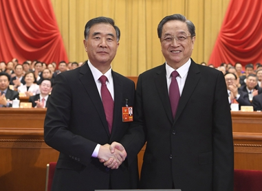 3月14日,全国政协十三届一次会议在北京人民大会堂举行第四次全体会议,当会议主持人宣布汪洋当选政协第十三届全国委员会主席后,俞正声与汪洋热烈...